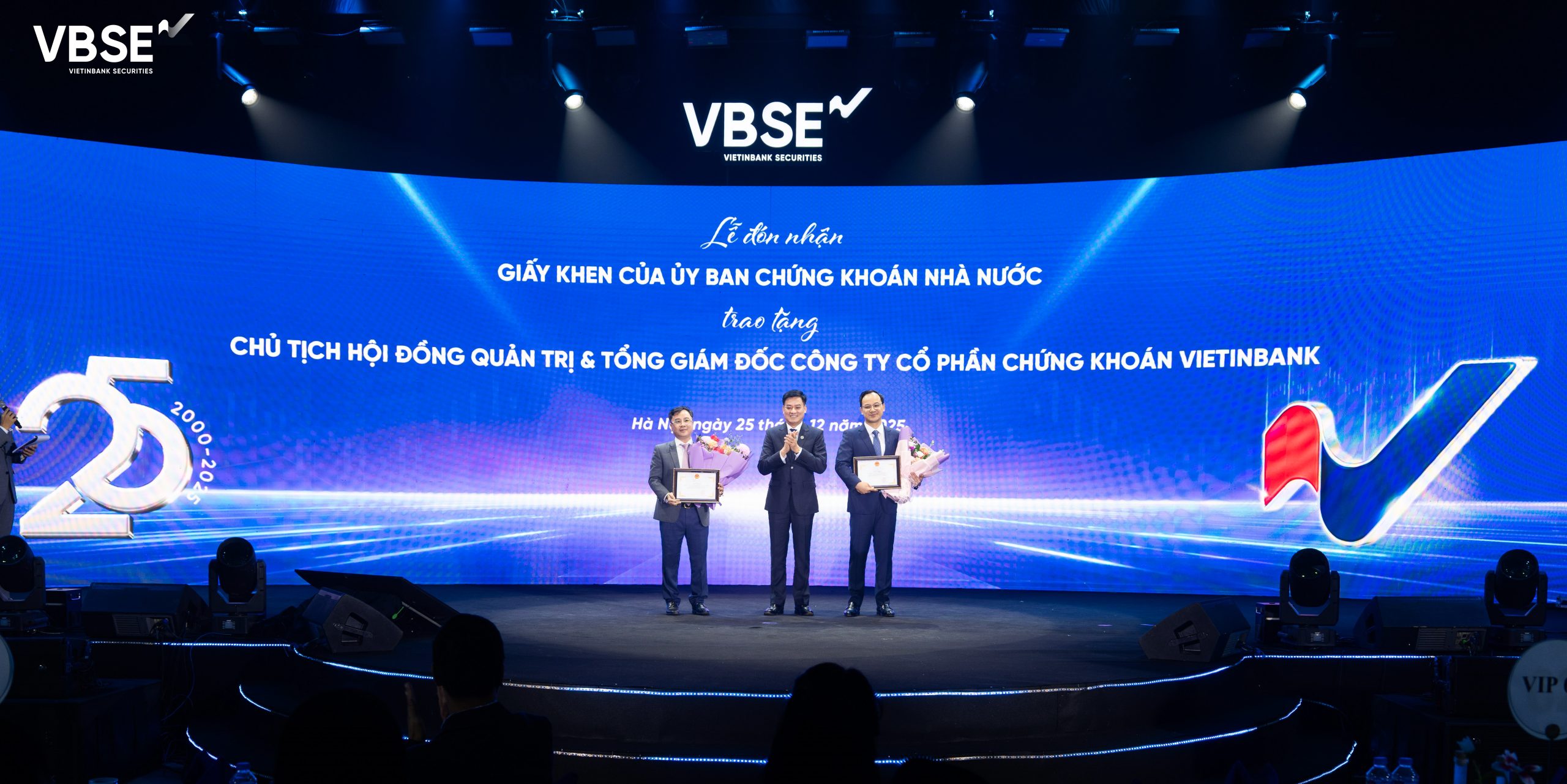 Ngày 25/12/2025, trong khuôn khổ Lễ Kỷ niệm 25 năm thành lập, Công ty Cổ phần Chứng khoán VietinBank (VBSE) vinh dự đón nhận Giấy khen của Ủy ban Chứng khoán Nhà nước nhằm ghi nhận những đóng góp tích cực của Công ty đối với sự phát triển của thị trường chứng khoán Việt Nam. Đồng thời, Chủ tịch Hội đồng quản trị và Tổng Giám đốc VBSE cũng được vinh danh vì những thành tích nổi bật trong công tác lãnh đạo, điều hành Công ty.