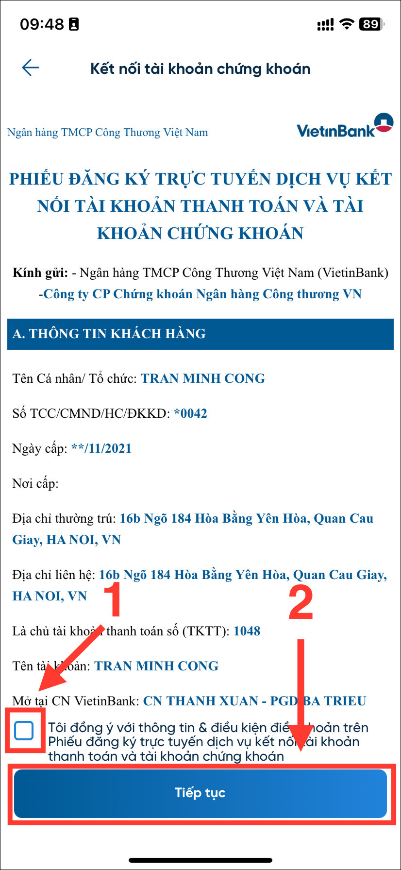 B9: Khách hàng thực hiện chọn “Tôi đồng ý …” sau đó chọn “Tiếp tục”