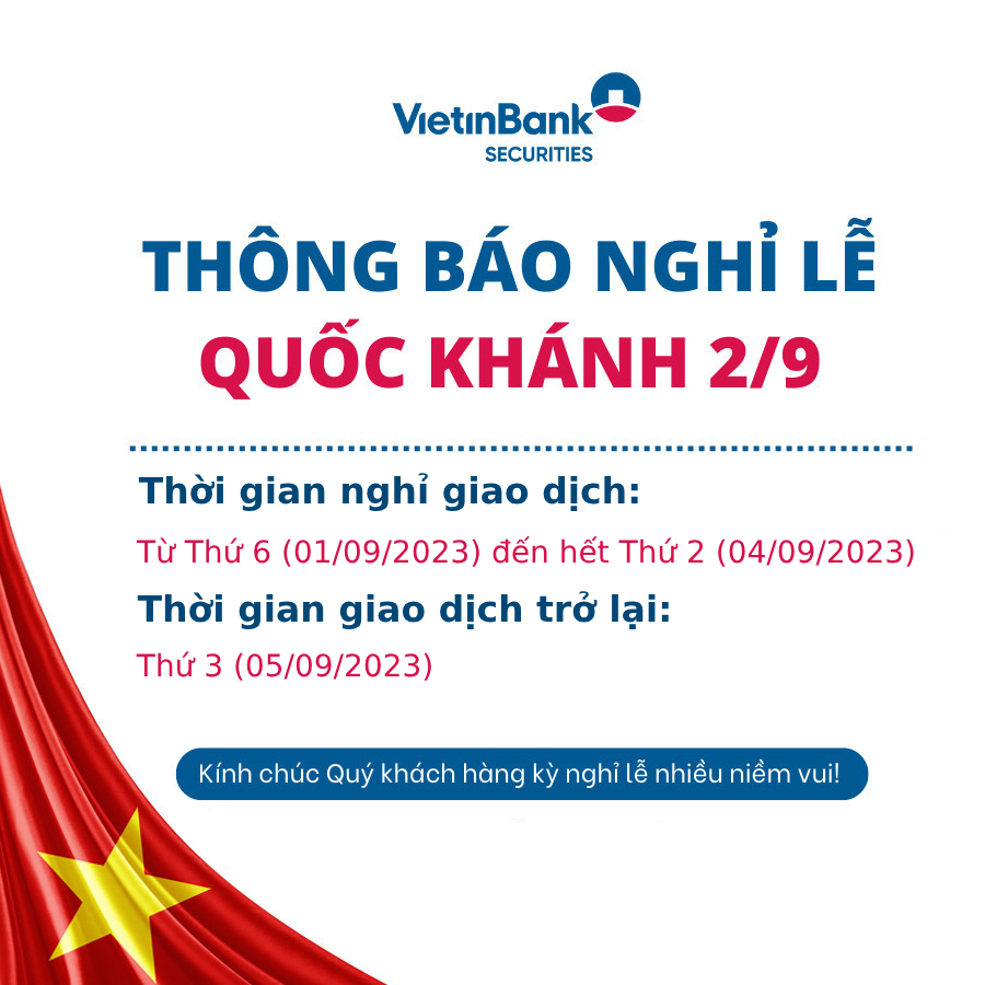 Công ty Cổ phần Chứng khoán Ngân hàng Công thương Việt Nam (VietinBank Securities) xin trân trọng thông báo tới Quý khách hàng, Quý đối tác lịch nghỉ lễ Quốc khánh 02/09/2023 như sau: